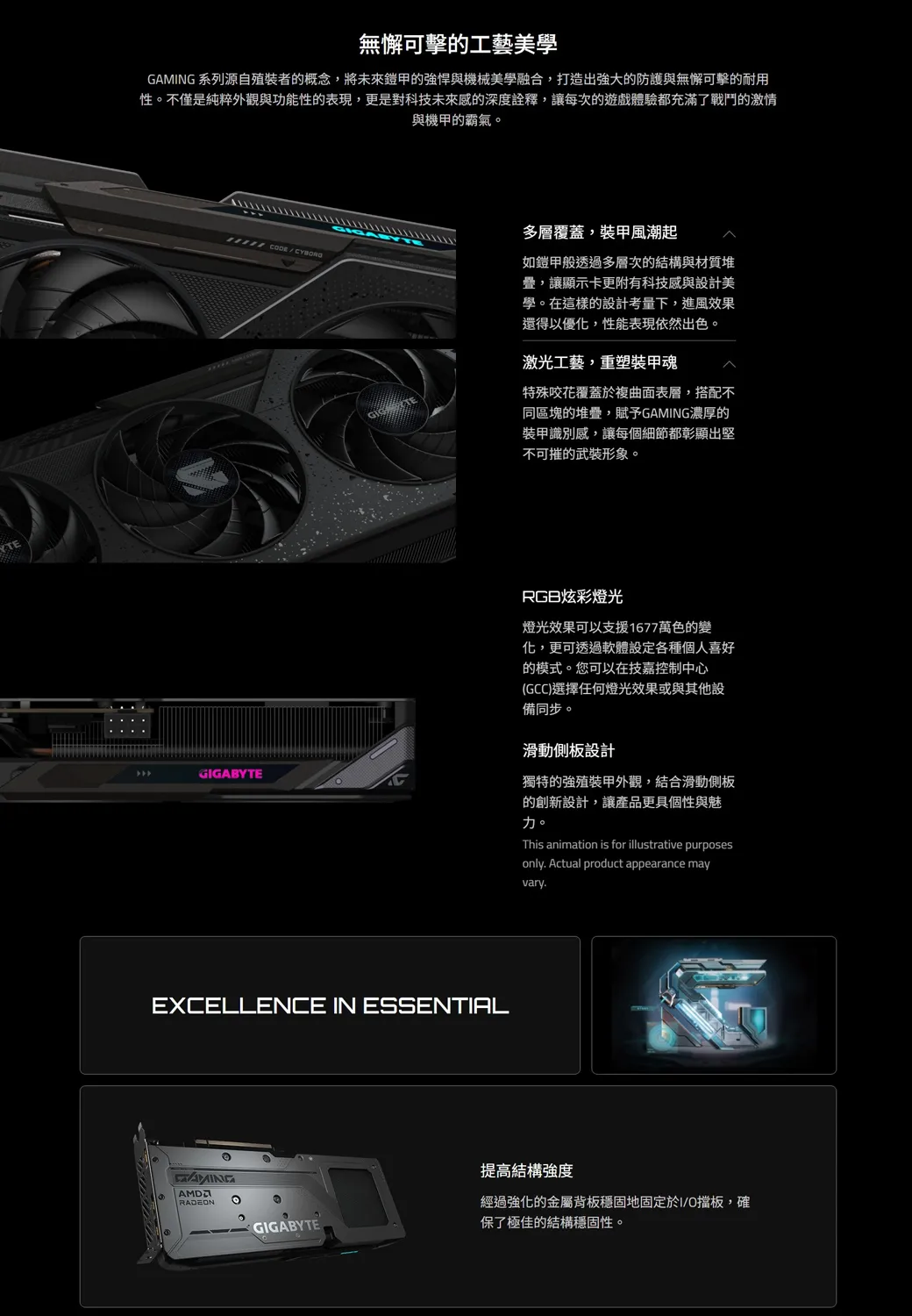TE無懈可擊的工藝美學 系列源自裝者的概念,將未來鎧甲的悍與機械美學融合,打造出強大的防護與無懈可擊的耐用性。不僅是純粹外觀與功能性的表現,更是對科技未來感的深度詮釋,讓每次的遊戲體驗都充滿了戰鬥的激情與機甲的霸氣。 多層覆蓋,裝甲風潮起如鎧甲般透過多層次的結構與材質堆疊,讓顯示卡更附有科技感與設計美學。在這樣的設計考量下,進風效果還得以優化,性能表現依然出色。激光工藝,重塑裝甲魂特殊咬花覆蓋於複曲面表層,搭配不同區塊的堆疊,賦予GAMING濃厚的裝甲識別感,讓每個細節都彰顯出堅不可摧的武裝形象。GIGABYTERGB炫彩燈光燈光效果可以支援1677萬色的變化,更可透過軟體設定各種個人喜好的模式。您可以在技嘉控制中心(GCC)選擇任何燈光效果或與其他設備同步。滑動側板設計獨特的強殖裝甲外觀,結合滑動側板的創新設計,讓產品更具個性與魅力。This animation is for illustrative purposesonly. Actual product appearance mayvary.EXCELLENCE IN ESSENTIALGAMINGRADENGIGABYTE提高結構強度經過強化的金屬背板穩固地固定於I/O擋板,確保了極佳的結構穩固性。