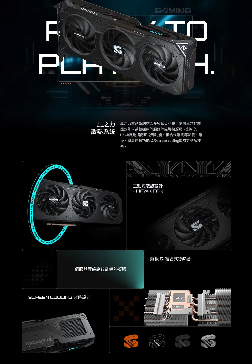 ADEONFMINATING THE GAMESGIGABYTE^H.風之力 風之力散熱系統結合多項頂尖科技,提供卓越的散散熱系統熱效能。系統採用伺服器等級導熱凝膠、創新的Hawk風扇搭配正逆轉功能、複合式銅質導熱管、銅板、風扇停轉功能以及screen cooling散熱等多項技術。主動式散熱設計 HAWK FAN銅板&複合式導熱管伺服器等級高效能導熱凝膠SCREEN COOLING 散熱設計GIGABYTE RGPUVRAM