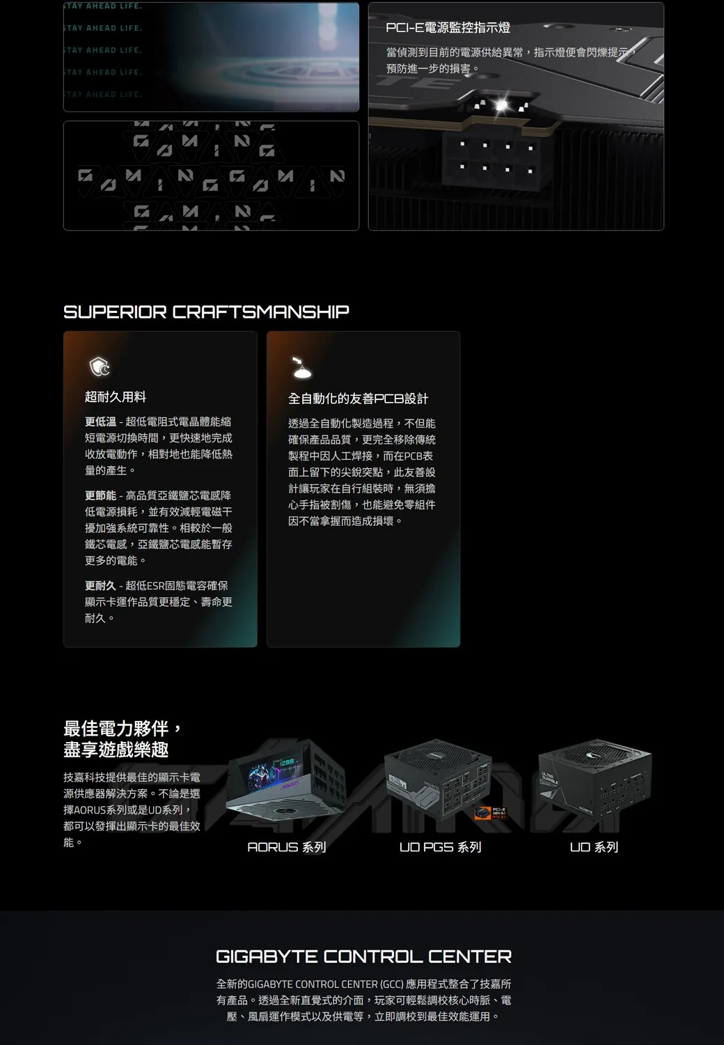 HEAD IFE AHEAD LIFE AHEAD LIFE.STAY AHEAD LIFE.ITAY AHEAD LIFE.LASUPERIOR CRAFTSMANSHIPNPCI-E電源監控指示燈當偵測到目前的電源供給異常指示燈便會閃爍提示,預防進一步的損害。超耐久用料更低溫-超低電阻式電晶體能縮短電源切換時間,更快速地完成收放電動作,相對地也能降低熱量的產生。更節能-高品質亞鐵芯電感降低電源損耗,並有效減輕電磁干擾加強系統可靠性。相較於一般鐵芯電感,亞鐵鹽芯電感能暫存更多的電能。更耐久 - 超低ESR固態電容確保顯示卡運作品質更穩定、壽命更耐久。全自動化的友善PCB設計透過全自動化製造過程,不但能確保產品品質,更完全移除傳統製程中因人工焊接,而在PCB表面上留下的尖銳突點,此友善設計讓玩家在自行組裝時,無須擔心手指被割傷,也能避免零組件因不當拿握而造成損壞。最佳電力夥伴,盡享遊戲樂趣技嘉科技提供最佳的顯示卡電源供應器解決方案。不論是選擇系列或是系列,都可以發揮出顯示卡的最佳效能。.AORUS 系列 PGS 系列UD 系列GIGABYTE CONTROL CENTER全新的GIGABYTE CONTROL CENTER (GCC) 應用程式整合了技嘉所有產品。透過全新直覺式的介面,玩家可輕鬆調校核心時脈、電壓、風扇運作模式以及供電等,立即調校到最佳效能運用。