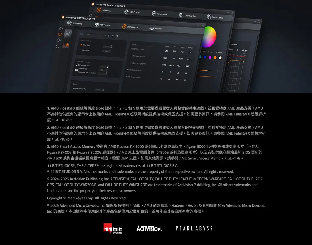 GIGABYTE NTROL CENTER GIGABYTE CONTROL CENTER Performance FAN PerformanceRPM 315225 16201012 21 CO331 AMD FidelityFX超級解析度FR)版本1、2、3和4適用於需要遊戲開發人員整合的特定遊戲並且受特定AMD 產品支援。AMD不為其他供應商的顯示卡上啟用的AMD FidelityFX 超級解析度提供技術或保固支援。如需更多資訊請 AMD FidelityFX 超級解析 GD-187b2 AMD FidelityFX 超級解析度(FR)版本1、2、3和4適用於需要遊戲開發人員整合的特定遊戲並且受特定AMD 產品支援。AMD不為其他供應商的顯示卡上啟用的AMD FidelityFX 超級解析度提供技術或保固支援。如需更多資訊請 AMD FidelityFX 超級解析 GD-3. AMD Smart Access Memory AMD Radeon RX 5000 Ryzen 3000(Ryzen 5 3400G 和 Ryzen 33200G 處理器)、AMD桌上型電腦套件(48005系列及更高版本)以及安裝供應商網站最新 BIOS 更新的AMD 500 系列主機板或更高版本相容。需要 OEM 支援。如需其他資訊請參閱 AMD Smart Access Memory。GD-178。11 BIT STUDIOS® THE ALTERS® are registered trademarks of 11 BIT STUDIOS S.A. 11 BIT STUDIOS S.A. All other marks and trademarks are the property of their respective owners. All rights reserved. 2024-2025 Activision Publishing, Inc. ACTIVISION, CALL OF DUTY, CALL OF DUTY LEAGUE, MODERN WARFARE, CALL OF DUTY BLACKOPS, CALL OF DUTY WARZONE, and CALL OF DUTY VANGUARD are trademarks of Activision Publishing, Inc. All other trademarks andtrade names are the property of their respective owners.Copyright Pearl Abyss Corp. All Rights Reserved. 2025 Advanced Micro Devices, Inc. AMD AMD Radeon Ryzen Advanced Micro Devices,Inc. 的商標。本出版物中使用的其他產品名稱僅用於識別目的,並可能為其各自所有者的商標。11bitACTIVISIONPEARL ABYSS