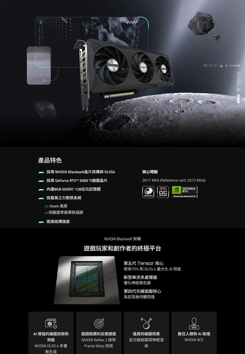 TO THE EGLEGIGABYT FUTURE2617 MHz (Reference card:2572 MHz)產品特色 Blackwell晶片架構與 DLSS4核心時脈採用 GeForce RTX™ 5060 Ti繪圖晶片內建8GB GDDR7128位元記憶體 技嘉風之力散熱系統 Hawk 風扇等級導熱凝膠 提高結構強度OCNVIDIAGEFORCERTXWINDFORCEEDITIONPowering Advanced NVIDIA Blackwell 架構遊戲玩家和創作者的終極平台第五代 Tensor 核心使用 FP4 和 DLSS4最大化 效能新型串流多處理器優化神經著色器第四代光線追蹤核心為巨型幾何體而建EAGLE AAI 增強的繪圖技術和效能遊戲致勝的反應速度逼真的繪圖效果數位人類和AI 助理NVIDIA DLSS 4 多畫格生成NVIDIA Reflex 2 採用Frame Warp 技術全光線追蹤與神經渲染NVIDIA ACE