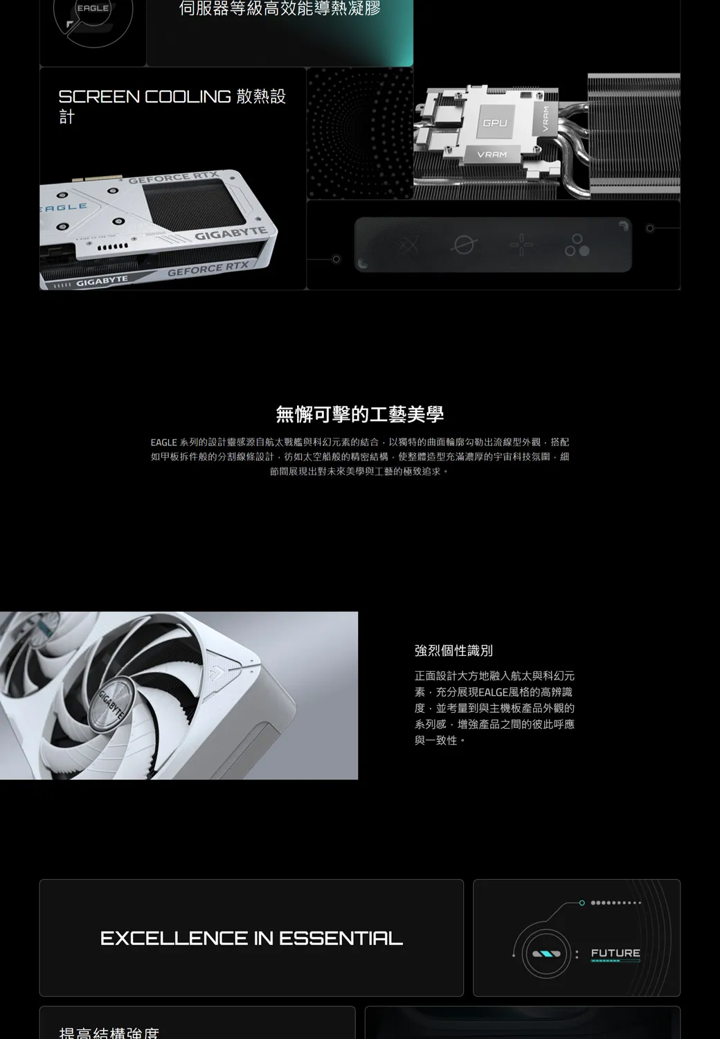 伺服器等級高效能導熱凝膠SCREEN COLING 散熱設計EGLEA GIGABYTEGEFORCE RTXGIGABYTEGIGABYTEGEFORCE RTXOӨGPUVRAM無懈可擊的工藝美學EAGLE 系列的設計靈感源自航太戰艦與科幻元素的結合以獨特的曲面輪廓勾勒出流線型外觀搭配如甲板拆件般的分割線條設計彷如太空船般的精密使整體造型充滿濃厚的宇宙科技氛圍細節間展現出對未來美學與工藝的極致追求。EXCELLENCE IN ESSENTIAL提高結構強強烈個性識別正面設計大方地融入航太與科幻元素充分展現EALGE風格的高辨識度並考量到與主機板產品外觀的系列感,增強產品之間的彼此呼應與一致性。FUTURE