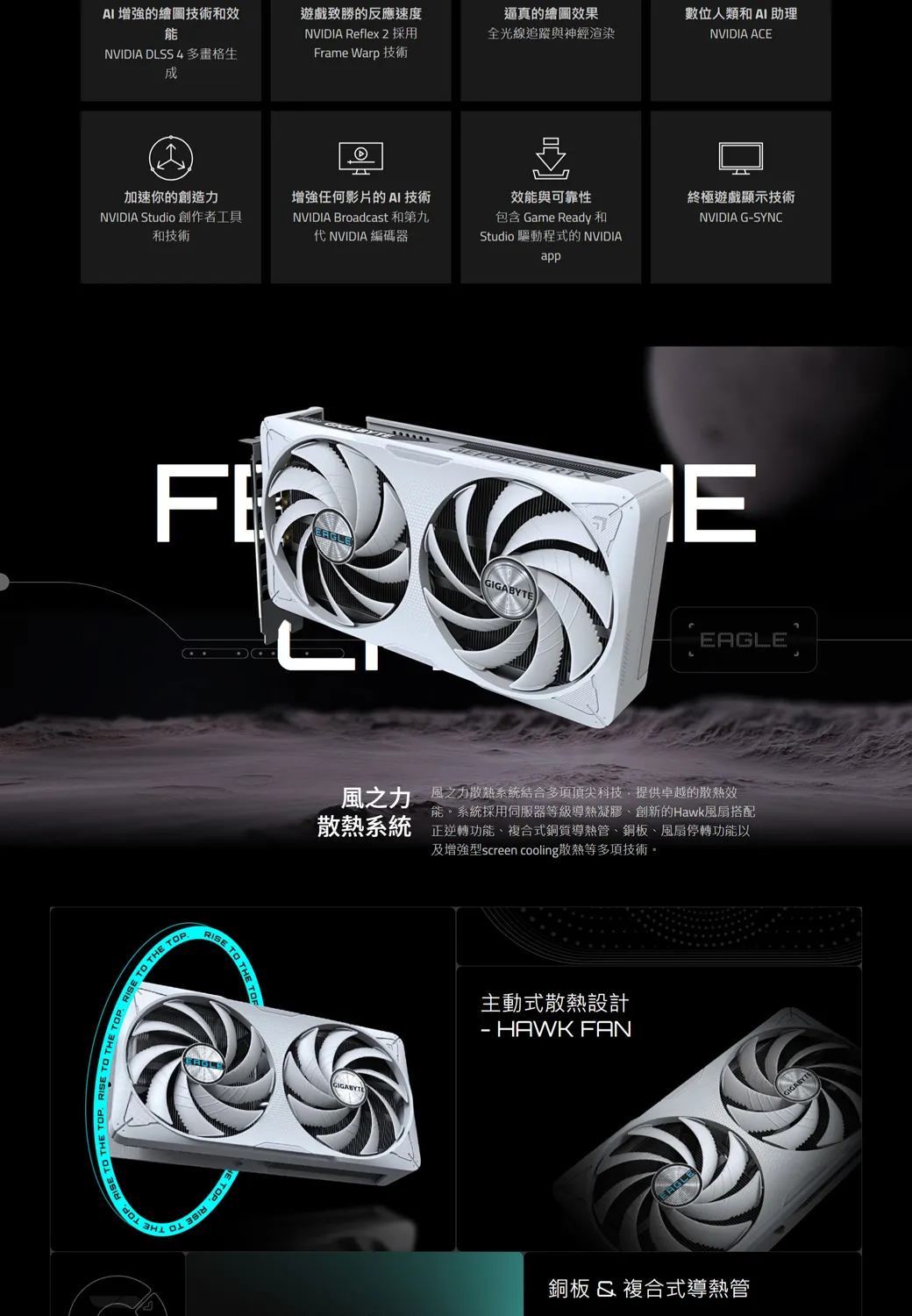 HE TO THE TOP RTO THE TOPAI的繪圖技術和效NVIDIA DLSS 4多畫格生遊戲致勝的反應速度NVIDIA Reflex 2 採用Frame Warp 技術逼真的繪圖效果數位人類和AI助理全光線追蹤與神經渲染NVIDIA ACE加速你的創造增強任何影片的AI 技術NVIDIA Studio 創作者工具和技術NVIDIA Broadcast 和第九代 NVIDIA 編碼器效與可靠性包含 Game Ready 和Studio 驅動程式的 NVIDIAapp終極遊戲顯示技術NVIDIA GSYNCFGIGABYTERISE TO THE T之力 風之力系統結合多項頂尖科技,提供卓越的散熱效散熱系統能系統採用伺服器等級導熱凝膠創新的Hawk風扇搭配正逆轉功能、複合式銅質導熱管、銅板、風扇停轉功能以及增強型screen cooling散熱等多項技術。主動式散熱設計- HAWK FANEAGLE銅板& 複合式導熱管