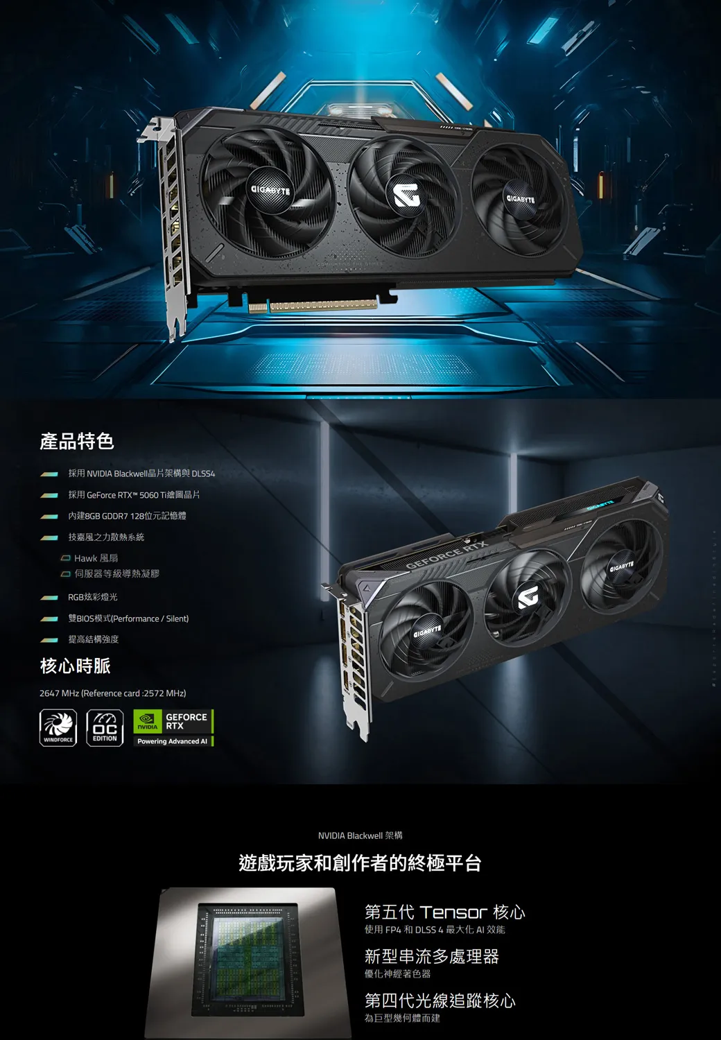 產品特色採用 Blackwell晶片架構與 DLSS4採用 GeForce RTX™ 5060 Ti繪圖晶片內建8GB GDDR7128位元記憶體技嘉風之力散熱系統 Hawk 風扇 伺服器等級導熱凝膠RGB炫彩燈光雙BIOS模式(Performance/Silent)提高結構強度核心時脈2647 MHz (Reference card:2572 MHz)GEFORCENVIDIA RTXWINDFORCEEDITIONPowering Advanced GEFORCE RTXNVIDIA Blackwell 架構遊戲玩家和創作者的終極平台第五代 Tensor 核心使用 FP4 和 DLSS4最大化 效能新型串流多處理器優化神經著色器第四代光線追蹤核心為巨型幾何體而建