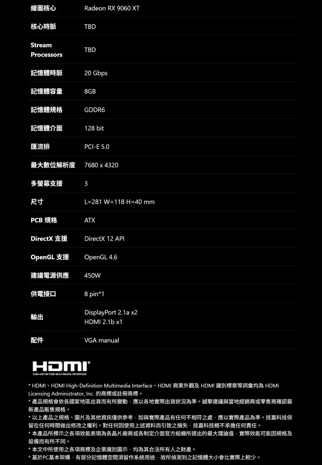 繪圖核心Radeon RX 9060 XT核心時脈TBDStreamTBDProcessors記憶體時脈20 Gbps記憶體容量8GB記憶體規格GDDR6記憶體介面128 bit匯流排PCI-E 5.0最大數位解析度 7680 4320多螢幕支援3尺寸L=281 W=118H=40mmPCB 規格ATXDirectX 支援DirectX 12 APIOpenGL 支援OpenGL 4.6建議電源供應450W供電接口8 pin*1輸出DisplayPort 2.1a x2HDMI 2.1b x1配件VGA manualHIGH-DEFINITION MULTIMEDIA INTERFACE* HDMI、HDMI High-Definition Multimedia Interface、HDMI 商業外觀及HDMI 識別標章等詞彙均為 HDMILicensing Administrator Inc. 的商標或註冊商標。*產品規格會依各國家地區出貨而有所變動應以各地實際出貨狀況為準。誠摯建議與當地經銷商或零售商確認最新產品販售規格。* 以上產品之規格、圖片及其他資訊僅供參考如與實際產品有任何不相符之處應以實際產品為準。技嘉科技保留在任何時間做出修改之權利。對任何因使用上述資料而引致之損失技嘉科技概不承擔任何責任。*本產品所標示之各項效能表現為各晶片廠商或各制定介面官方組織所提出的最大理論值實際效能可能因規格及設備而有所不同。* 本文中所使用之各項商標及企業識別圖示,均為其合法所有人之財產。* 基於PC基本架構,有部分記憶體空間須留作系統用途,故所偵測到之記憶體大小會比實際上較少。
