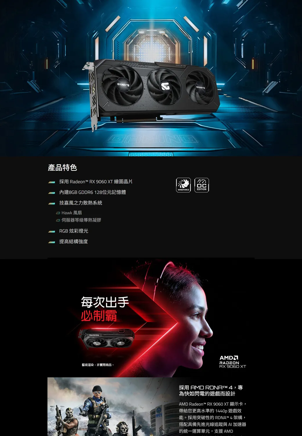 產品特色採用 Radeon™ RX 9060 XT 繪圖晶片內建8GB GDDR6128位元記憶體技嘉風之力散熱系統 Hawk 風扇伺服器等級導熱凝膠RGB 炫彩燈光提高結構強度每次出手必制霸藝術渲染非實際商品。WINDFORCEOCEDITIONRADEONRX XT採用 AMD ,專為快如閃電的遊戲而設計AMD Radeon™ RX 9060 XT 顯示卡,帶給您更高水準的1440p 遊戲效能。採用突破性的RDNA™4架構,搭配具備先進光線追蹤與AI加速器的統一運算單元,支援AMD