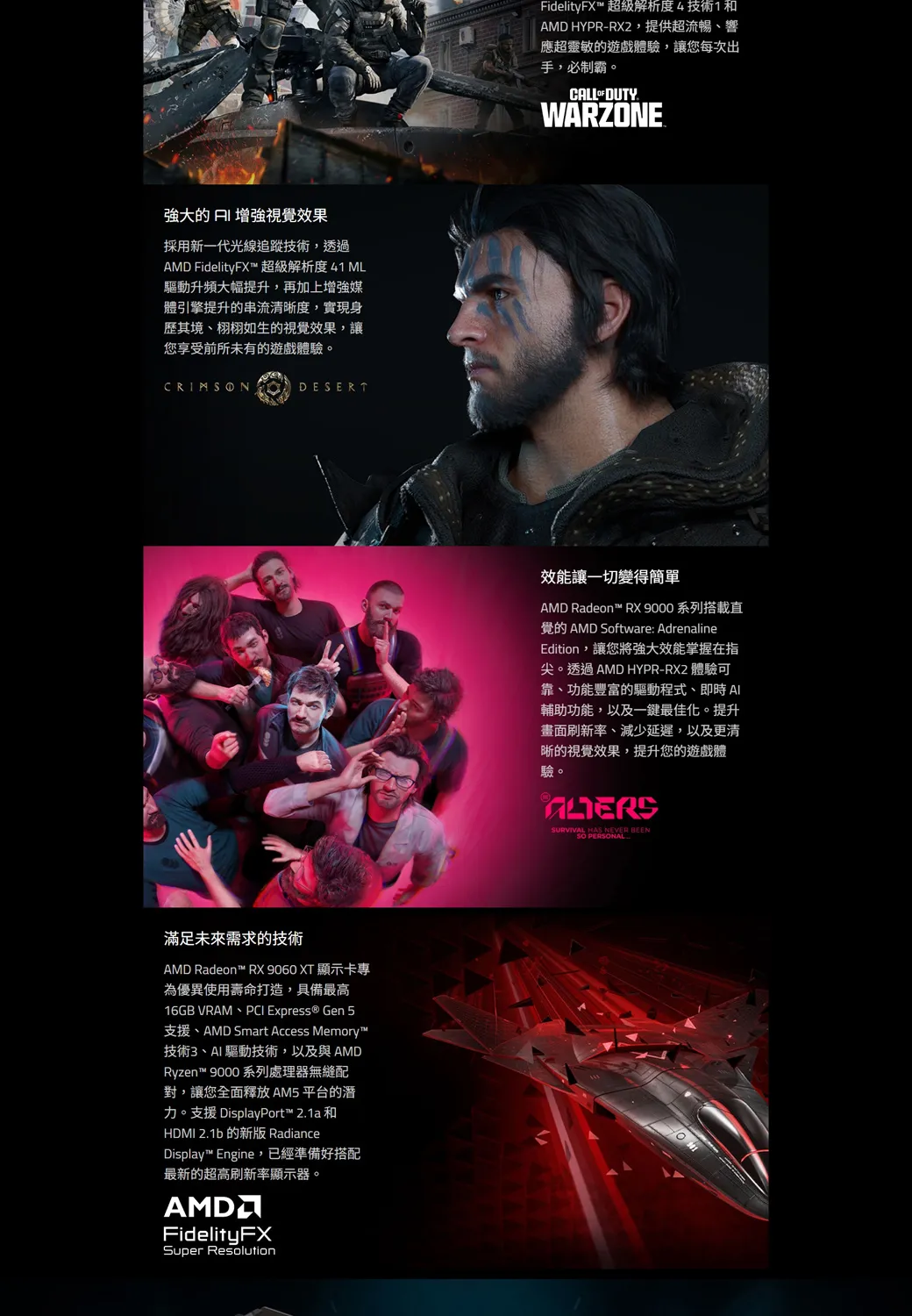 強大的 增強視覺效果採用新一代光線追蹤技術,透過 FidelityFX™ 超級解析度41 ML驅動升頻大幅提升,再加上增強媒體引擎提升的串流清晰度,實現身歷其境、栩栩如生的視覺效果,讓您享受前所未有的遊戲體驗。DESERT滿足未來需求的技術AMD Radeon™ RX 9060 XT 顯示卡專為優異使用壽命打造,具備最高16GB VRAM、PCI Express ® Gen 5支援、AMD Smart Access Memory™技術3、AI驅動技術,以及與AMDRyzen™ 9000 系列處理器無縫配對,讓您全面釋放 AM5 平台的潛力。支援 DisplayPort™ 21a和HDMI 2.1b 的新版 RadianceDisplay™ Engine,已經準備好搭配最新的超高刷新率顯示器。AMDFidelityFXSuper ResolutionFidelityFX™ 超級解析度4技術1和AMD HYPR-RX2,提供超流暢、響應超靈敏的遊戲體驗,讓您每次出手,必制霸。CALL DUTY.WARZONE效能讓一切變得簡單AMD Radeon™ RX 9000 系列搭載直覺的 AMD Software: AdrenalineEdition,讓您將強大效能掌握在指尖。透過AMD HYPR-RX2 體驗可靠、功能豐富的驅動程式、即時 Al輔助功能,以及一鍵最佳化。提升畫面刷新率、減少延遲,以及更清晰的視覺效果,提升您的遊戲體驗。SURVIVAL HAS NEVER BEEN PERSONAL