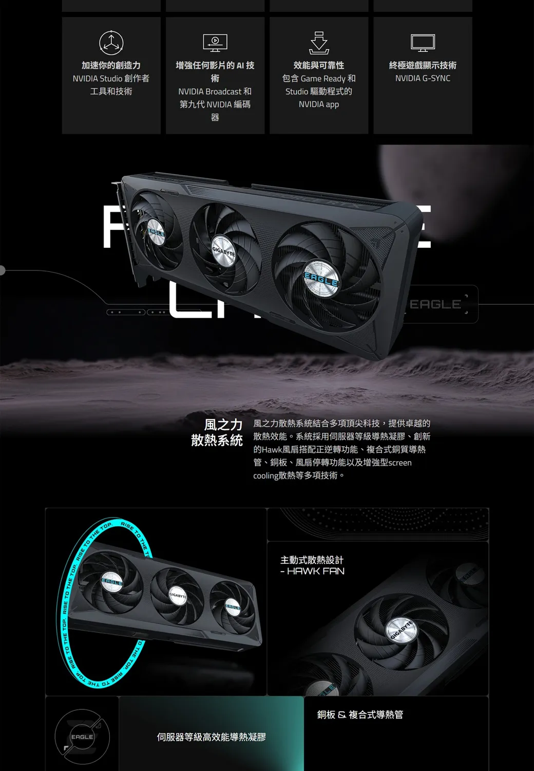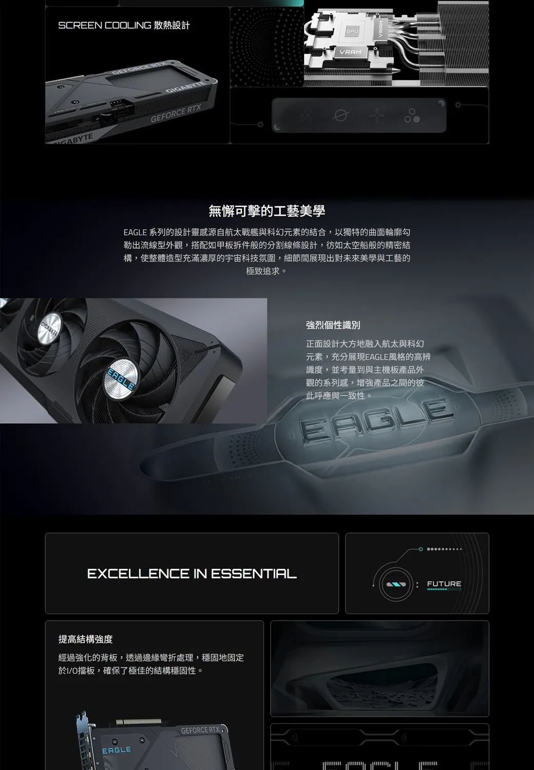 SCREEN COOLING 散熱設計GPUGABYTEGEFORCE RTXVRAM無懈可擊的工藝美學EAGLE 系列的設計靈感源自航太戰艦與科幻元素的結合,以獨特的曲面輪廓勾勒出流線型外觀,搭配如甲板拆件般的分割線條設計,彷如太空船般的精密結構,使整體造型充滿濃厚的宇宙科技氛圍,細節間展現出對未來美學與工藝的極致追求。GIGABYTEEAGLE強烈個性識別正面設計大方地融入航太與科幻元素,充分展現EAGLE風格的高辨識度,並考量到與主機板產品外觀的系列感,增強產品之間的彼此呼應與一致性。EAGLEEXCELLENCE IN ESSENTIALFUTURE提高結構強度經過強化的背板,透過邊緣彎折處理,穩固地固定I/O擋板,確保了極佳的結構穩固性。GEFORCE RTXEAGLE