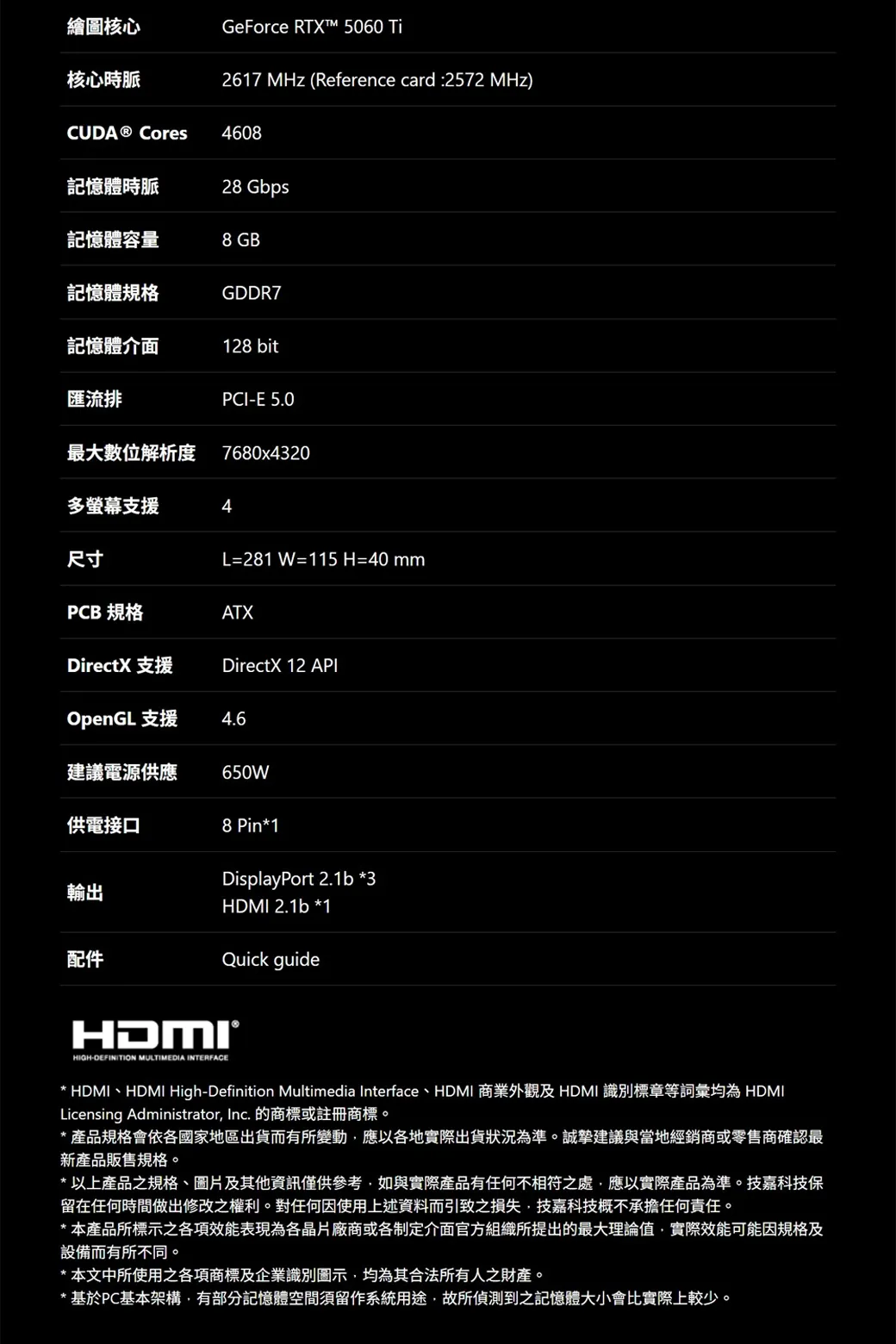 繪圖核心GeForce RTXT™ 5060 核心時脈2617 MHz (Reference card :2572 MHz)CUDA® Cores4608記憶體時脈28 Gbps記憶體容量8 GB記憶體規格GDDR7記憶體介面128 bit匯流排PCIE 5.0最大位解析度 7680x4320多螢幕支援4尺寸L=281 W=115 H=40 mmPCB 規格ATXDirectX 支援DirectX 12 APIOpenGL 支援4.6建議電源供應650W供電接口8 Pin*1DisplayPort 2.1b *3輸出HDMI 2.1b *1配件Quick guideHIGH-DEFINITION MULTIMEDIA INTERFACE* HDMI、HDMI High-Definition Multimedia Interface、HDMI 商業外觀及 HDMI 識別標章等詞彙均為 HDMILicensing Administrator Inc. 的商標或註冊商標。* 產品規格會依各國家地區出貨而有所變動應以各地實際出貨狀況為準。誠摯建議與當地經銷商或零售商確認最新產品販售規格。*以上產品之規格、圖片及其他資訊僅供參考如與實際產品有任何不相符之處應以實際產品為準。技嘉科技保留在任何時間做出修改之權利。對任何因使用上述資料而引致之損失技嘉科技概不承擔任何責任。*本產品所標示之各項效能表現為各晶片廠商或各制定介面官方組織所提出的最大理論值,實際效能可能因規格及設備而有所不同。* 本文中所使用之各項商標及企業識別圖示,均為其合法所有人之財產。* 基於PC基本架構,有部分記憶體空間須留作系統用途,故所偵測到之記憶體大小會比實際上較少。