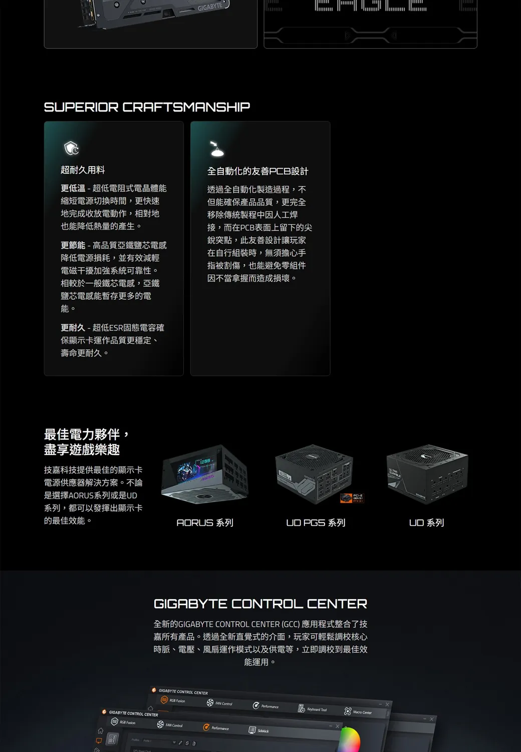 GIGABYTESUPERIOR CRAFTSMANSHIP超耐久用料更低溫-超低電阻式電晶體能縮短電源切換時間,更快速地完成收放電動作,相對地也能降低熱量的產生。更節能-高品質亞鐵鹽芯電感降低電源損耗,並有效減輕電磁干擾加強系統可靠性。相較於一般鐵芯電感,亞鐵鹽芯電感能暫存更多的電能。更耐久 - 超低ESR固態電容確保顯示卡運作品質更穩定、壽命更耐久。全自動化的友善設計透過全自動化製造過程,不但能確保產品品質,更完全移除傳統製程中因人工焊接,而在PCB表面上留下的尖銳突點,此友善設計讓玩家在自行組裝時,無須擔心手指被割傷,也能避免零組件因不當拿握而造成損壞。最佳電力夥伴,盡享遊戲樂趣技嘉科技提供最佳的顯示卡電源供應器解決方案。不論是選擇系列或是系列,都可以發揮出顯示卡的最佳效能。AORUS 系列 系列UD 系列口GIGABYTE CONTROL CENTER全新的GIGABYTE CONTROL CENTER (GCC) 應用程式整合了技嘉所有產品。透過全新直覺式的介面,玩家可輕鬆調校核心時脈、電壓、風扇運作模式以及供電等,立即調校到最佳效能運用。GIGABYTE CONTROL CENTER Performance Macro CenterGIGABYTE CONTROL CENTERRGB FAN