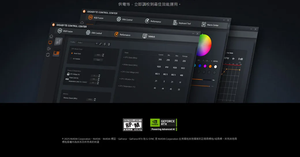 GIGABYTE ONTROL CENTER供電等,立即調校到最佳效能運用。GIGABYTE CONTROL CENTER FAN Keyboard Toolacro Center FusionFAN Performance RPM C M 315225 GEFORCERP-M RTX Powering Advanced 2025 NVIDIA Corporation NVIDIA NVIDIA GeForce GeForce RTX G-SYNC NVIDIA Corporation和版權均為其各自所有者的