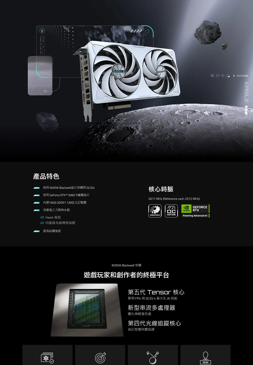 T THE TOPEAGLE產品特色採用 NVIIA Blackwll晶片架構 DLSS4採用 GeForce RTX™ 5060 Ti繪圖晶片內建16GB GDDR7128位元記憶體風之力散熱系統Hawk 風扇伺服器等級導熱凝膠提高結構強度核心時脈 D 2617 MHz (Reference card:2572 MHz)EAGLE OeGEFORCE RTXWINDFORCEEDITIONPowering Advanced NVIDIA Blackwell 架構遊戲玩家和創作者的終極平台第五代 Tensor 核心使用 FP4 和 DLSS4 效能新型串流多處理器優化神經著色器第四代光線追蹤核心為巨型幾何體而建
