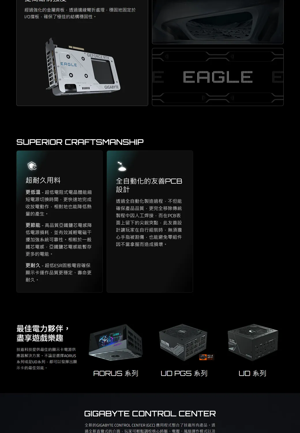 經過強化的金屬透過邊緣彎折處理穩固地固定於O擋板確保了極佳的結構穩固性GEFORCE RTXEAGLEEAGLEGIGABYTESUPERIOR CRAFTSMANSHIP超耐久用料更低溫-超低電阻式電晶體能縮短電源切換時間更快速地完成收放電動作相對地也能降低熱量的產生。更節能 - 高品質亞鐵鹽芯電感降低電源損耗並有效減輕電磁加強系統可靠性。相較於一般鐵芯電感亞鐵鹽芯電感能暫存更多的電能。更耐久 -超低ESR固態電容確保顯示卡運作品質更穩定、壽命更耐久。全自動化的友善PCB設計透過全自動化製造過程不但能確保產品品質更完全移除傳統製程中因人工焊接,而在PCB表面上留下的尖銳突點,此友善設計讓玩家在自行組裝時,無須擔心手指被割傷,也能避免零組件因不當拿握而造成損壞。最佳電力夥伴,盡享遊戲樂趣技嘉科技提供最佳的顯示卡電源供應器解決方案。不論是選擇系列或是系列,都可以發揮出顯示卡的最佳效能。AORUS 系列 PG5 系列 GIGABYTE CONTROL CENTER全新的GIGABYTE CONTROL CENTER (GCC) 應用程式整合了技嘉所有產品。透過全新直覺式的介面,玩家可輕鬆調校核心時脈、電壓、風扇運作模式以及UD 系列
