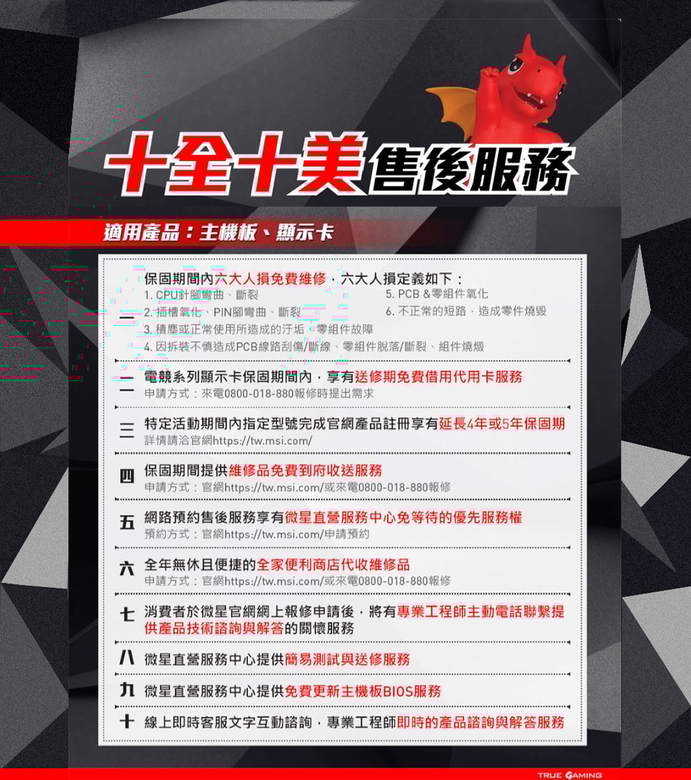 全十美售後服務適用產品:主機板顯示卡保固期間六大人損免費維修六大人損定義如下:1. CPU針腳彎曲、斷裂2. 插槽氧化、PIN腳彎曲、斷裂3. 積塵或正常使用所造成的、零組件故障5. PCB&零組件氧化6. 不正常的短路造成零件燒毀 拆裝不慎造成PCB線路刮傷/斷線、零組件脫落/斷裂、組件燒燬電競系列顯示卡保固期間,享有送修期免費借用代用卡服務申請方式:來電0800-018-880報修時提出需求特定活動期間內指定型號完成官網產品註冊享有延長4年或5年保固期詳情請洽官網https://tw.msi.com/保固期間提供維修品免費到府收送服務申請方式:官網https://tw.msi.com/或來電0800-018-880報修五 網路預約售後服務享有微星直營服務中心免等待的優先服務權預約方式:官網https://tw.msi.com/申請預約六 全年無休且便捷的全家便利商店代收維修品申請方式:官網https://tw.msi.com/或來電0800-018-880報修 消費者於微星官網網上報修申請後,將有專業工程師主動電話聯繫提供產品技術諮詢與的關懷服務 微星直營服務中心提供簡易測試與送修服務九 微星直營服務中心提供免費更新主機板BIOS服務十 線上即時客服文字互動諮詢,專業工程師即時的產品諮詢與解答服務TRUE GAMING